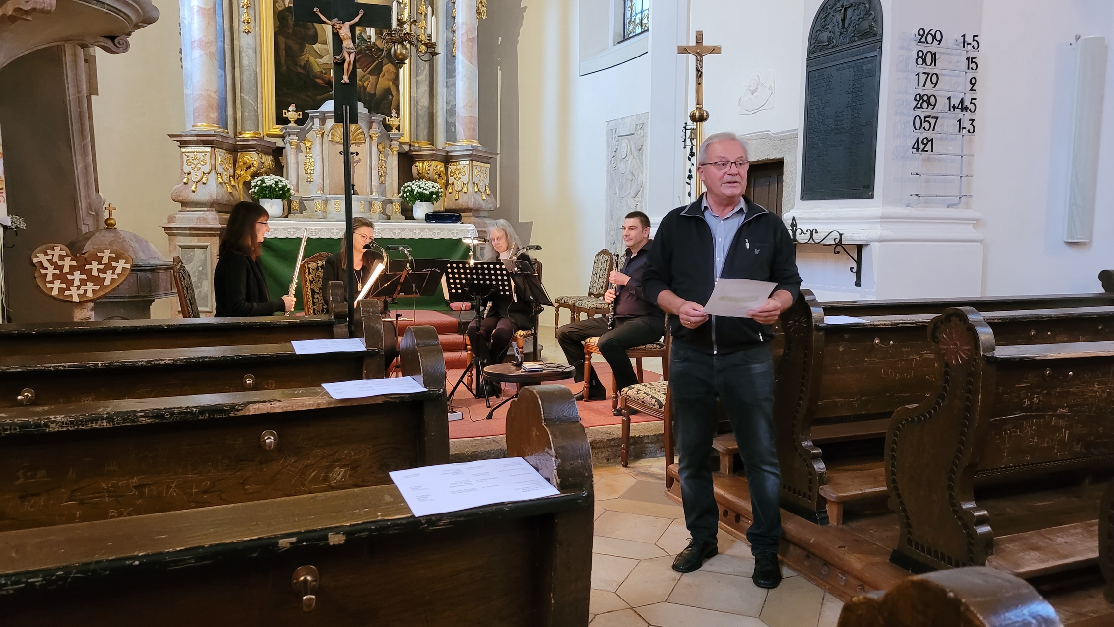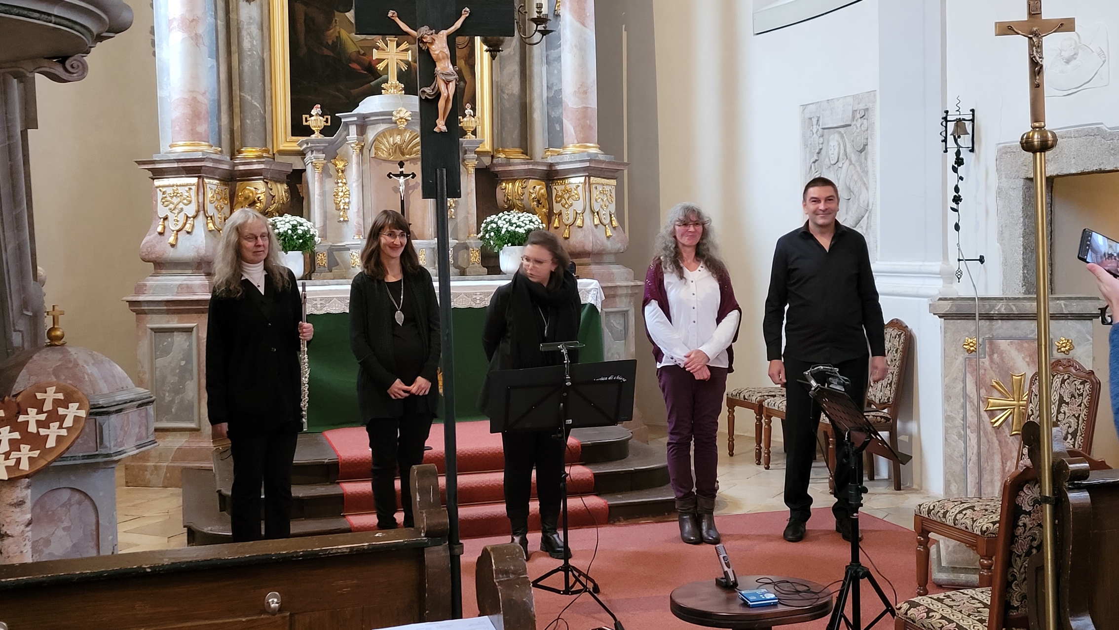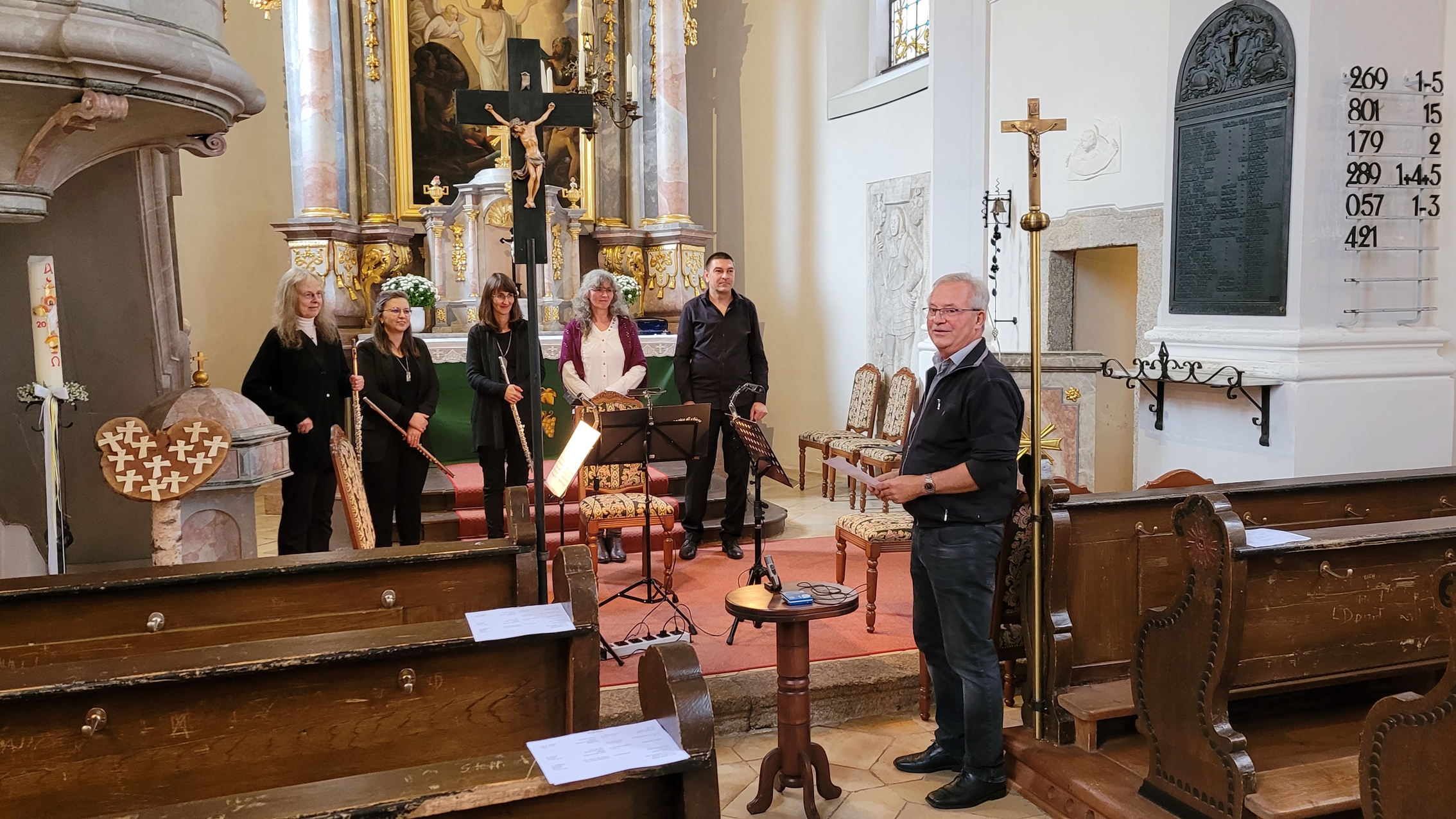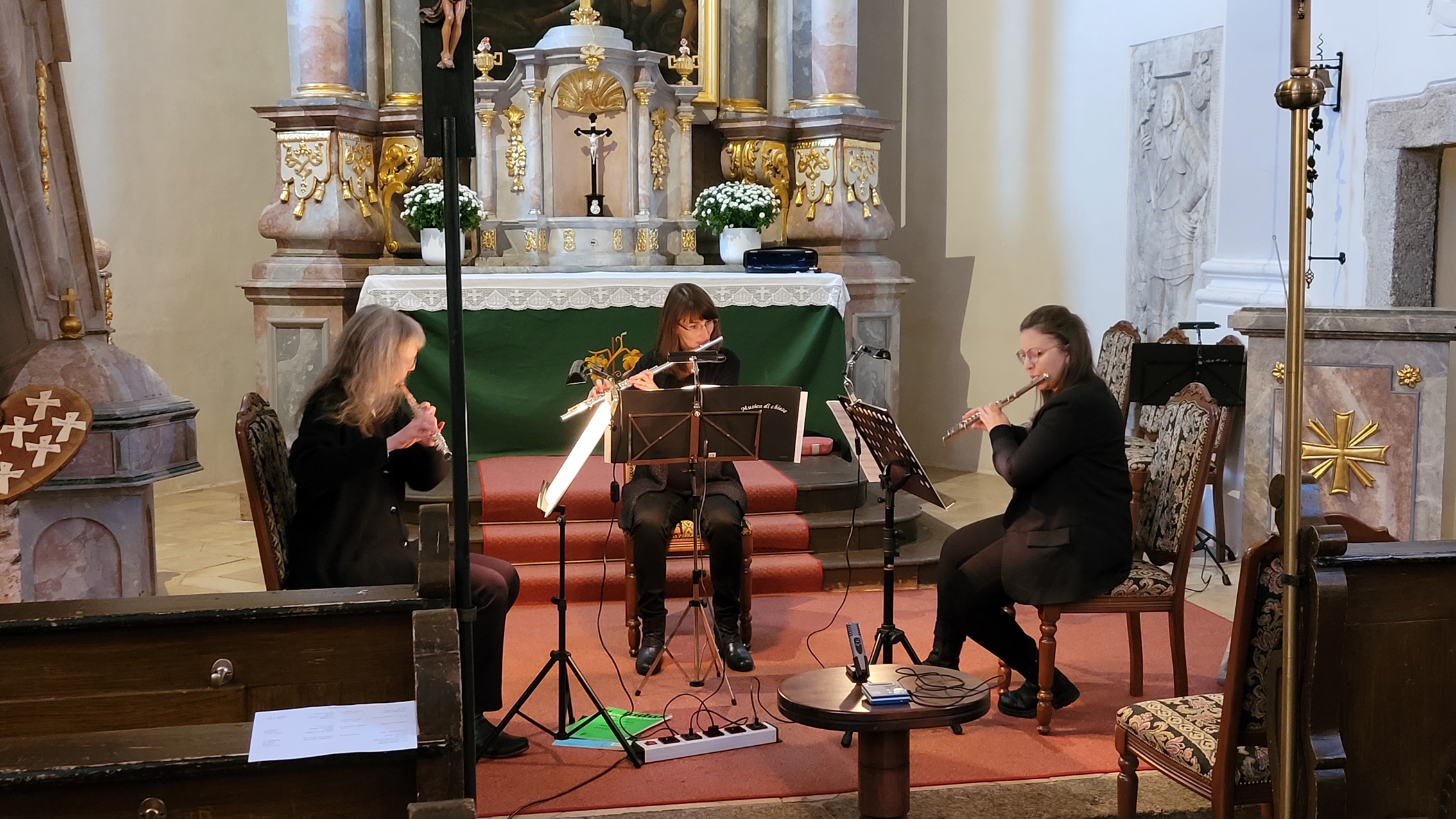 Wunderbare Musik erschallte heute Nachmittag aus unserer Kirche: drei Querflöten, eine Oboe und unsere Orgel. Nach der Begrüßung durch den Vertrauensmann Helmut Fichtner spielten Viola Schweinfurter, Janina Leinhäupl. Julia Schubert, Markus Krisch und Monika Werner in unterschiedlichen Besetzungen Werke von Händel, Kummer, Mozart, Blavet, Keller und Callahan.