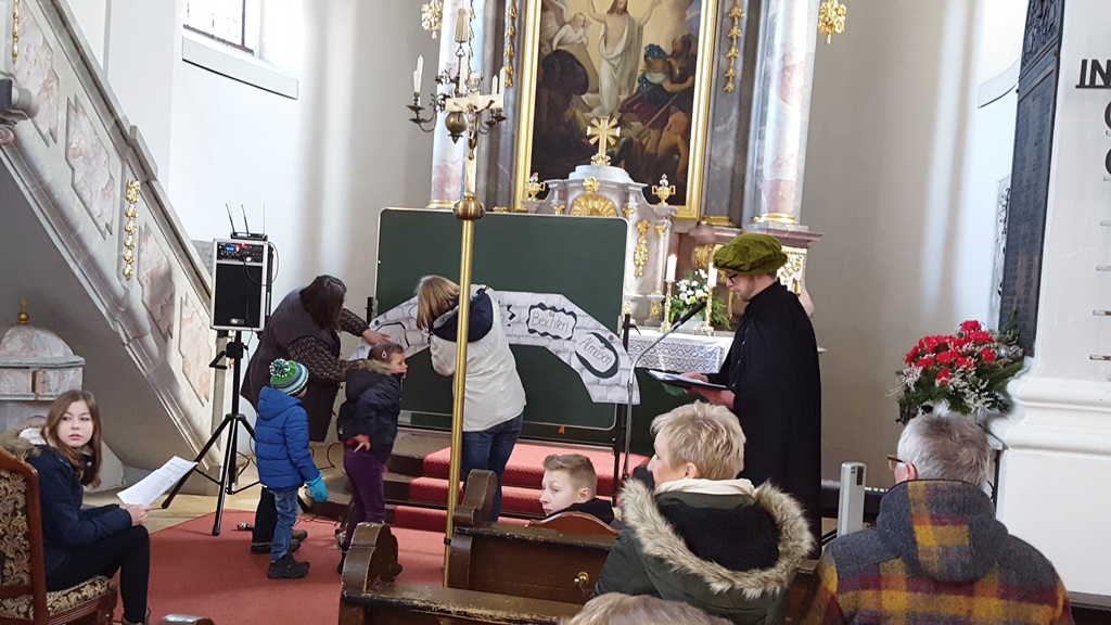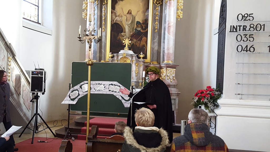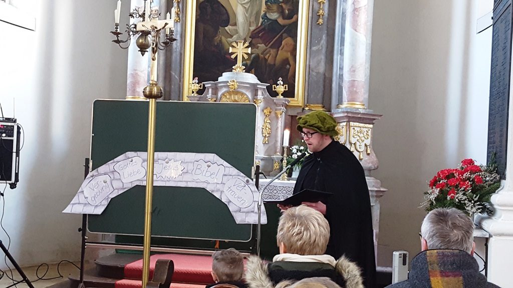 Als evangelisch-lutherische Christen feiern wir in diesem Jahr das 500jährige Jubiläum der Reformation. Martin Luther hat mit seinem Denken und Handeln diese Reformation angestoßen. Seine Gedanken erreichten die Öffentlichkeit erstmals mit dem Thesenanschlag am 31. Oktober 1517. Dieser Thesenanschlag stand auch im Mittelpunkt unseres Familiengottesdienstes. Jung und Alt, Groß und Klein konnten sich am letzten Sonntag in die Zeit Martin Luthers mitnehmen lassen. Dabei stand seine Entdeckung im Zentrum, dass wir nicht versuchen müssen Gott gnädig zu stimmen und versuchen müssen zu ihm zu kommen, sondern dass er zu uns kommt. In seinem Sohn Jesus Christus hat er uns den Weg zu Gott (symbolisiert durch eine Brücke) gebaut. Wenn wir darauf vertrauen (und Glaube heißt ja nichts anderes!), dann gehen wir schon jetzt über diese Brücke zu Gott.