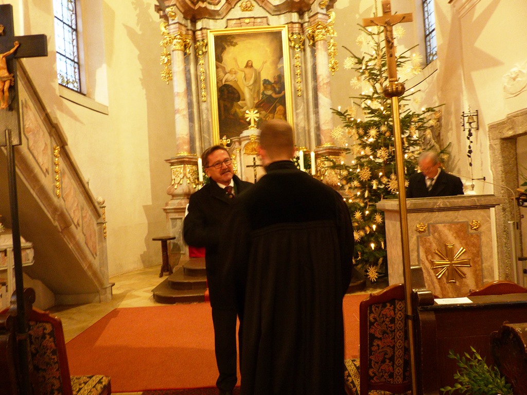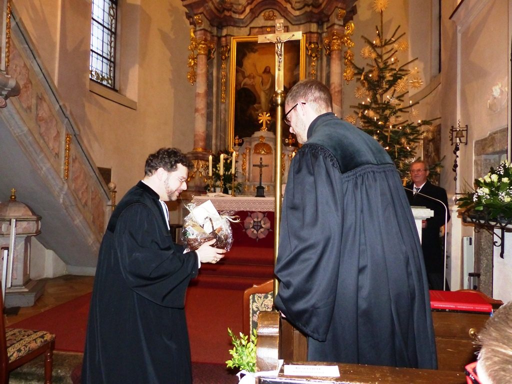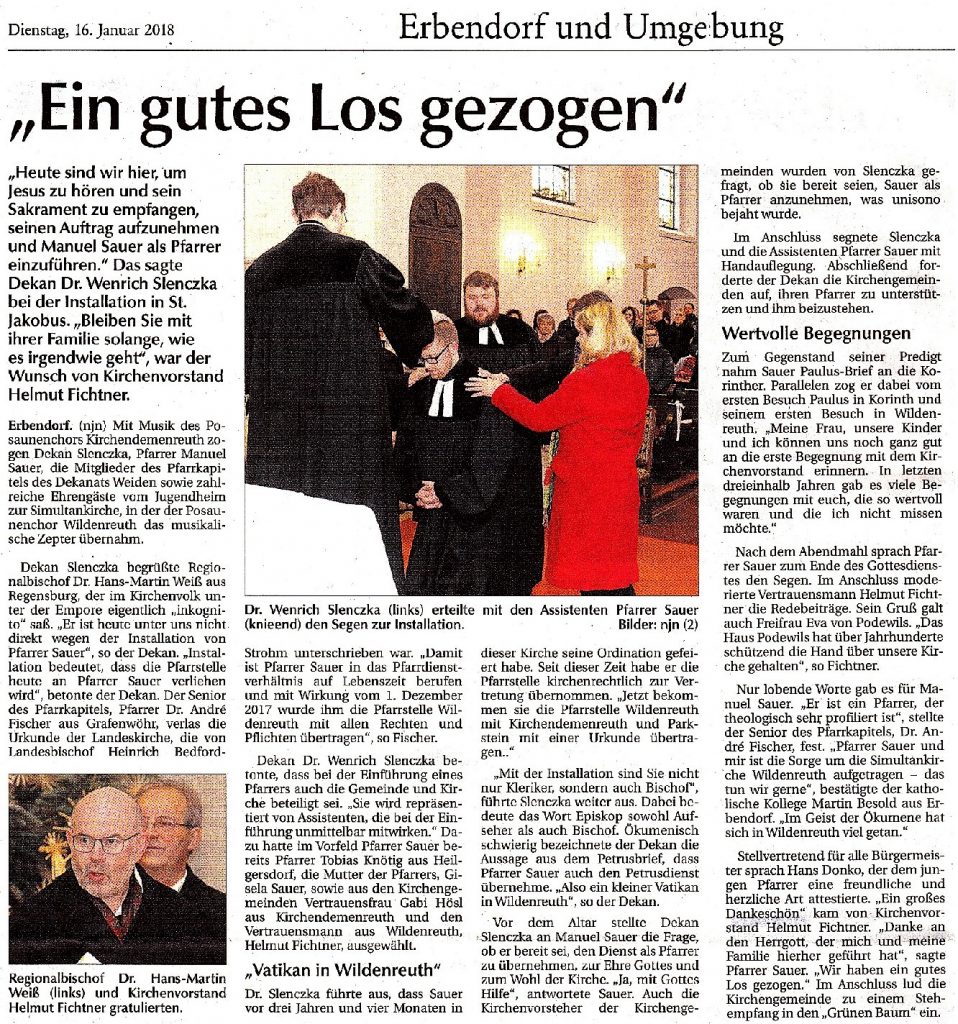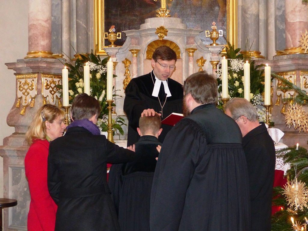 Dr. Slenczka begrüßte die zahlreich erschienene Gemeinde. Pfarrer Dr. André Fischer verlas die Urkunde, mit welcher Herr Sauer die Pfarrstelle Wildenreuth mit allen Rechten und Pflichten übertragen wird. Unter Handauflegung der vier Assistenten – Frau Gisela Sauer (Mutter), Pfarrer Tobias Knötig, Vertrauensmann Helmut Fichtner und Vertrauensfrau Karin Hösl – wurde Herr Sauer von Dr. Slenczka gesegnet.