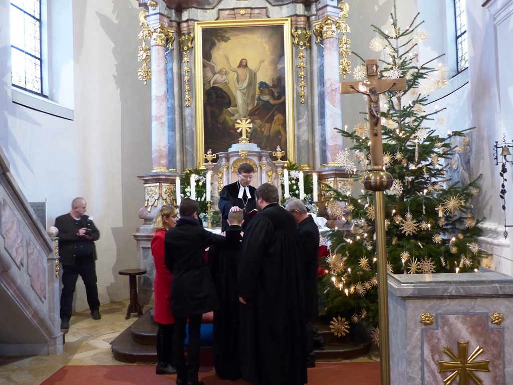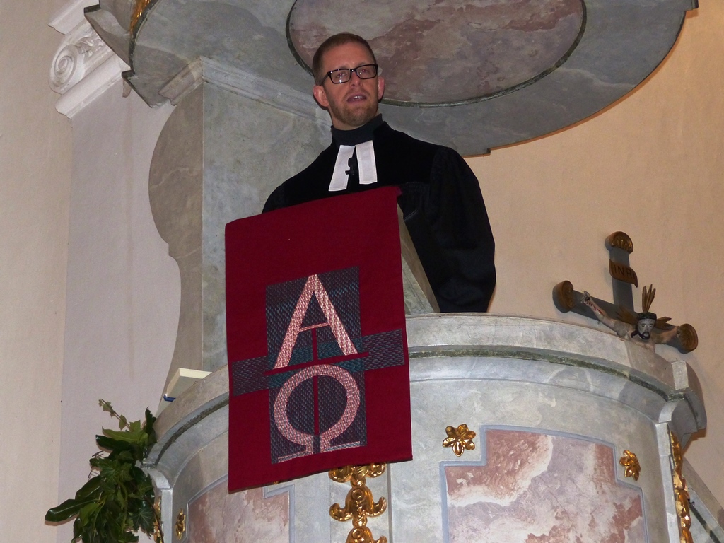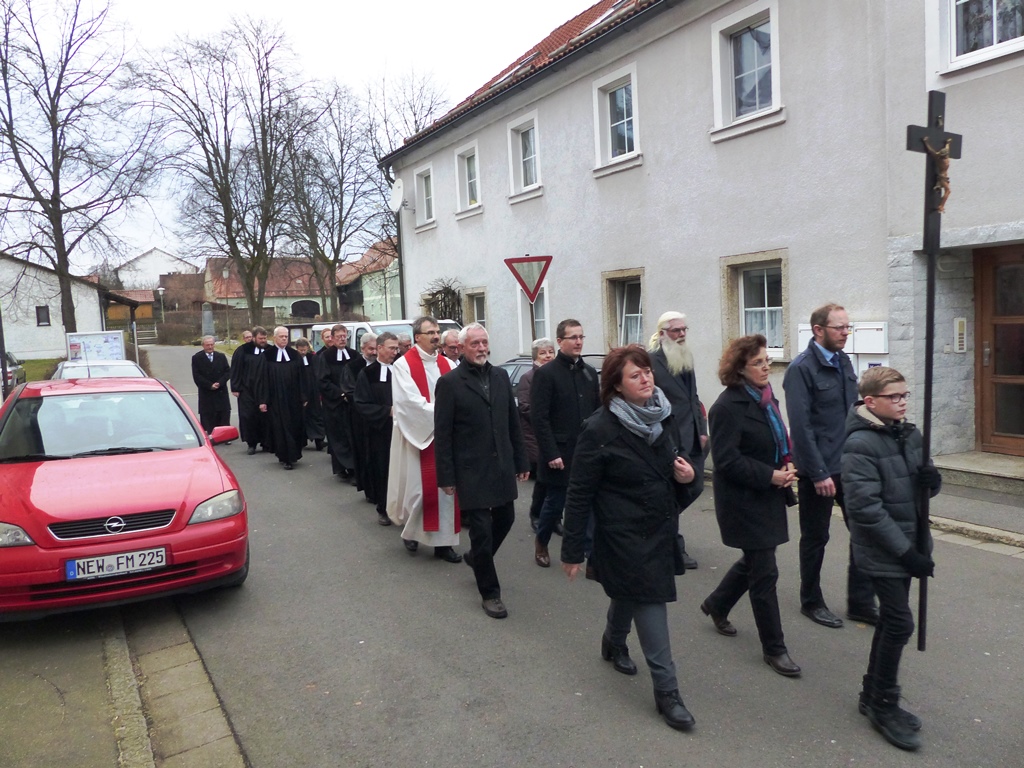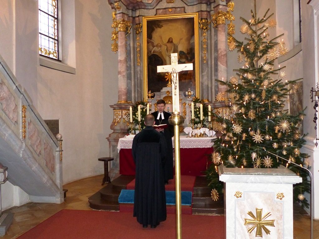 Dr. Slenczka begrüßte die zahlreich erschienene Gemeinde. Pfarrer Dr. André Fischer verlas die Urkunde, mit welcher Herr Sauer die Pfarrstelle Wildenreuth mit allen Rechten und Pflichten übertragen wird. Unter Handauflegung der vier Assistenten – Frau Gisela Sauer (Mutter), Pfarrer Tobias Knötig, Vertrauensmann Helmut Fichtner und Vertrauensfrau Karin Hösl – wurde Herr Sauer von Dr. Slenczka gesegnet.