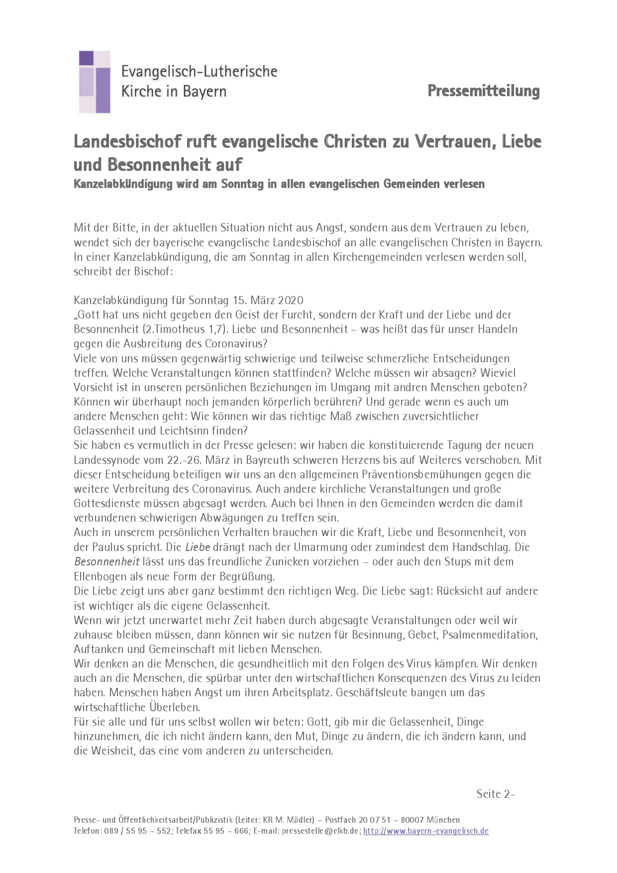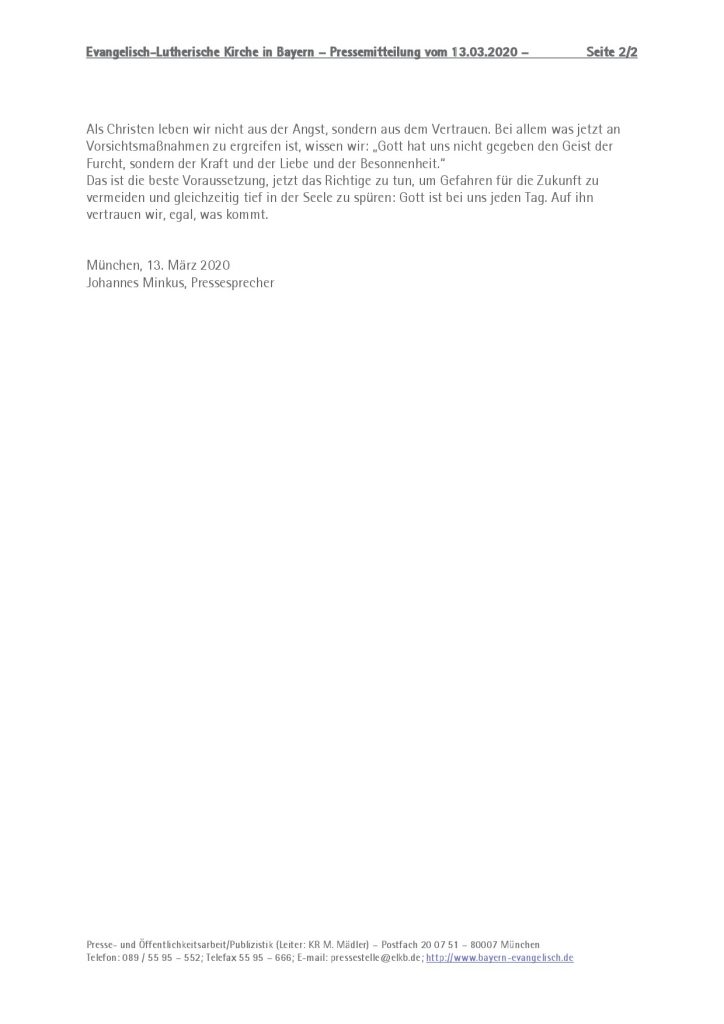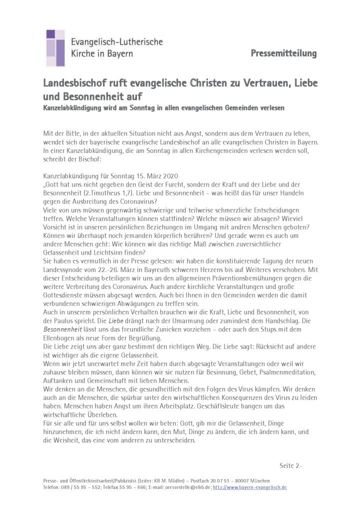 Mit der Bitte, in der aktuellen Situation nicht aus Angst, sondern aus dem Vertrauen zu leben, wendet sich der bayerische evangelische Landesbischof an alle evangelischen Christen in Bayern. In einer Kanzelabkündigung, die am Sonntag in allen Kirchengemeinden verlesen werden soll, schreibt der Bischof: